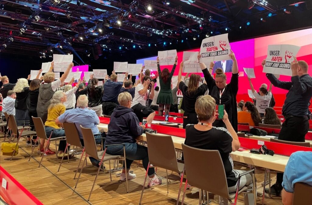 Von 1.009 Delegierten nahmen 853 an der Abstimmung teil, davon stimmten lediglich 657 für den Leitantrag (gerade einmal 65%), 170 mit NEIN! – 26 Delegierte enthielten sich. Und DAS bei einem Leitantrag des Bundesvorstands und Gewerkschaftsrats…