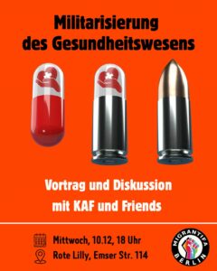 Diskussion zur Militarisierung des Gesundheitswesens mit KAF (Kollektiv für Anarcho Feminismus) und Friends 10.Dezember 2025, 18 UhrRote Lilly, Emser Str. 114, Sprache: Deutsch Die laufende Militarisierung der Gesellschaft macht auch vor dem Gesundheitswesen keinen Halt. Wir informieren in unserem Vortrag über geplante Maẞnahmen zur Militarisierung des Gesundheitswesens, die Kontexte in denen diese geplant werden und … Weiterlesen