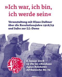 Veranstaltung mit Klaus Dallmer über die Revolutionsjahre 1918/19und Infos zur LL-Demo 8.Januar 2026 19 Uhr im KiezhausAgnes Reinholda, Afrikanische Str74 Кlaus Dallmer hat das Buch »Die Meuterei auf der »Deutschland« 1918/19 – Anpassung, Aufbäumen und Untergang der ersten deutschen Arbeiterbewegung« geschrieben. Er wird uns einen Überblick geben über die historische Entwicklung der Arbeiter*innenbewegung in der … Weiterlesen