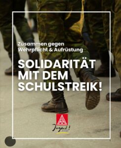 Bundesweit hat sich die IG Metall Jugend gegen Militarisierung, Wehrpflicht und jegliche Zwangsverpflichtungen ausgesprochen. Etliche Orts- und Landesverbände solidarisieren sich heute mit den streikenden Schülern und rufen dazu auf, sich an den Aktionen aktiv zu beteiligen! Hier beispielhaft die IGM Jugend von Frankfurt a Main: Bayern: IG Metall Jugend ruft landesweit zur Beteiligung am 5. … Weiterlesen