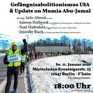 Gefängnisabolitionismus USA& Update on Mumia Abu-Jamal dt/engl. Info-Abend mit/with Saleem Holbrook(ex-Gefangener aus Pennsylvania // Abolitionist Law Center) Noel Hanrahan(Anwältin Mumia Abu-Jamal / Prison Radio) 1 Jennifer Black Co-Autorin mit Mumia von „Beneath The Mountain“) So. 11. Januar 2026, 18 Uhr Mieterladen Kreutzigerstr. 2310247 Berlin-F’hain (U5-Samariterstr.) Info: freiheit-fuer-mumia.de Freiheit für Mumia Abu-Jamal Mumia Abu-Jamal ist ein … Weiterlesen