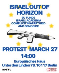 Am 27. März demonstrieren Studierende in über 30 Städten in der gesamten EU, um den Ausschluss Israels aus dem Horizon-Programm zu fordern. Kommt am 27. März um 14:00 Uhr in Berlin zum Europäischen Haus, Unter den Linden 78, 10117 Berlin Um was geht es? Während Israel seinen Völkermord im Gazastreifen fortsetzt und eine beispiellose Aggression … Weiterlesen