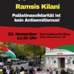 - Der Erhalt der Mitgliedschaft von Ramsis Kilani in der Linken ist eine Grundsatzfrage – kommt und solidarisiert Euch!Am 22. November geht das Verfahren über die Mitgliedschaft von Ramsis Kilani in der Linken in die nächste Runde. Diesmal soll ihm sogar eine erneute mündliche Anhörung verwehrt werden. Palästina-Solidarität ist kein Antisemitismus Solikundgebung Karl-Liebknecht-Haus, 22. November 11:30 Uhr Was Ramsis Kilani fordert ist nichts anderes als die generelle Einhaltung von Menschenrecht und Völkerrecht. Das … Weiterlesen