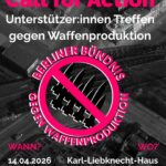 - Call for Acton – Unterstützer:innen Treffen gegen WaffenproduktionDer Sommer wird antimilitaristisch und dafür brauchen wir Euch! Und angesichts der Weltlage braucht die Menschheit Antimilitarismus! Unterstützer:innen Treffen 14. April um 17-19 Uhr, Rosa-Luxemburg-Saal im Karl-Liebknecht-Haus (Kleine Alexanderstraẞe 28) Das Berliner Bündnis gegen Waffenproduktion, bestehend aus über 20 Organisationen, ruft für den 10.-11. Juli bundesweit zu Aktionstagen gegen Krieg auf. Anlass ist der Beginn … Weiterlesen