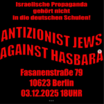 Am Mittwoch 03. Dezember stellt die Deutsch-Israelische Gesellschaft Berlin Brandenburg im jüdischen Gemeindehaus in Charlottenburg die Broschüre „Fakten statt Fake – Was ist los im Nahen Osten?“ vor. Anders als der Titel vemuten lassen könnte, geht es den Herausgebenden allerdings nicht um Aufklärung, sondern um Hasbara. Also um so genannte „Öffentlichkeitsarbeit“ im Sinne des israelischen Staates, kurz Staatspropaganda. Gegen die Instrumentalisierung des Antisemitismusbegriffs für diesen Zweck, welche die Broschüre durchzieht, organisieren antizionistische Aktivist:innen Protest. Lehrer:innen und Pädagog:innen ist dringend zu empfehlen einen großen Bogen um diese Desinformationskampagne zu machen und statt dessen mit Projekten zusammen zu arbeiten, die die Erfahrungen und Meinungen unserer Schüler:innen ernst nehmen und den gegenseitigen Austausch auf Augenhöhe zum Ziel haben. Außerdem gilt es unbedingt für diese Projekte einzustehen, wenn der selbsternannte Antisemitismusbekämpfer im Roten Rathaus den Versuch unternimmt ihnen die Fördermittel zu entziehen. Den selbstverständlich haben wir auch an Berliner Schulen ein Antisemitismusproblem. Und zwar nicht erst seit konservative Kräfte wie Kai Wegner entdeckt haben, dass sie den Kampf gegen einen vermeintlich neuen Antisemitismus für ihre reaktionäre Politik instrumentalisieren können. - Generation Antifa in der Offensive