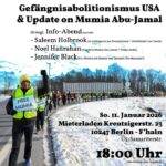 Gefängnisabolitionismus USA& Update on Mumia Abu-Jamal dt/engl. Info-Abend mit/with Saleem Holbrook(ex-Gefangener aus Pennsylvania // Abolitionist Law Center) Noel Hanrahan(Anwältin Mumia Abu-Jamal / Prison Radio) 1 Jennifer Black Co-Autorin mit Mumia von „Beneath The Mountain“) So. 11. Januar 2026, 18 Uhr Mieterladen Kreutzigerstr. 2310247 Berlin-F’hain (U5-Samariterstr.) Info: freiheit-fuer-mumia.de Freiheit für Mumia Abu-Jamal Mumia Abu-Jamal ist ein … Weiterlesen - debanking stoppen – Offener Brief an GLS Bank gegen Kontokündigungen linker Organisationen