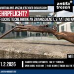 „Nie wieder Fachismus, nie wieder Krieg”. Beides gehört zusammen in einem kapitalistischen System. „Der Schoß ist fruchtbar noch, aus dem das kroch“. Das war erlebte Gewissheit nach Weltkrieg und Hitlerfaschismus – auch weit in die Parteien von SPD bis CDU hinein. Wer Militarisierung und Krieg bekämpfen will, muss die Faschisierung in der Gesellschaft bekämpfen. Wer … Weiterlesen - Tresen mit Vortrag: Wehrpflicht? – Antifaschistische Kritik an Zwangsdienst, Staat und Nation