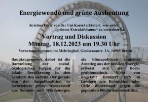 - Energiewende und grüne AusbeutungVortrags- undDiskussionsreihe zur Klimadebatte und sozial-ökologischen Transformation. Die 2. Veranstaltung unserer Reihe wird sich mit dem Thema des GrünenExtraktivismus beschäftigen: *Energiewende und grüne Ausbeutung* Montag 18. Dezember 19.30 Uhr im Versammlungsraum im Mehringhof,Gneisenaustr. 2, in Kreuzberg* Hauptaugenmerk dabei ist die Darstellung der sozial-ökologischen Folgen für die lokale Bevölkerung in den Ländern des Südens. Der gerade … Weiterlesen