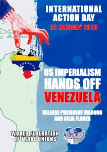 - 22. Januar: Internationaler Aktionstag der WFTU in Solidarität mit VenezuelaDie World Federation of Trade Unions, WFTU, repräsentiert kämpferische Gewerkschaften aus 126 Ländern, darunter COSATU in Südafrika, USB Italien, Arbeiterkoordination Spanien, PAME Griechenland.Wir veröffentlichen den WFTU Aufruf zum Aktionstag am 22. Januar: 12. Januar 2026 von WFTU HQ Nach dem Einsatz von US-Truppen in der Karibik unter dem Vorwand des Krieges gegen den Drogenhandel und … Weiterlesen