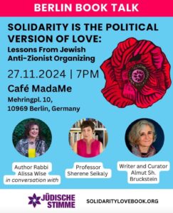 - Solidarität ist die politische Form von LiebeDie Jüdische Stimme für einen gerechten Frieden in Nahost lädt zu einem besonderen Abend im Café MadaMe ein, am Mittwoch, den 27. November, 19 Uhr Mehringplatz 10, 10969 Berlin „Rabbi Alissa Wise ist bei uns, um ihr neues Buch vorzustellen, das sie gemeinsam mit Rebecca Vilkomerson verfasst hat: „Solidarity is the Political Version of Love: … Weiterlesen