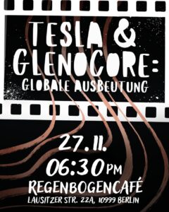 - Tesla X Glencore: Globale Ausbeutung für die Elektromobilität -Film und DiskussionTesla X Glencore: Globale Ausbeutung für die Elektromobilität Film Vorführung und Diskussion 27.11.2025 ab 18:30 Uhr, Regenbogencafé Neukölln Lausitzer Straße 22A Der Rohstoffkonzern Glencore beutet weltweit Ressourcen aus. Besonders dramatisch sind die Folgen in Peru: Durch die Kupferminen werden Landstriche verwüstet, Wasserquellen vergiftet und Menschen verfolgt oder in den Tod getrieben. Das Kupfer landet unter … Weiterlesen