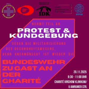 - Protestkundgebung gegen die Militarisierung des GesundheitswesensProtestkundgebung 20.11.20 25 von 8:30 – 11:00 UhrCharité Virchow Klinikum /U-Bahn, Amrumer Straẞe Vom 20. -22.11.25 findet an der Charité das Symposium ,Zivile Notfall- und Rettungsmedizin im Bevölkerungsschutz“ statt, bei dem es auch um die Einbindung, Vorbereitung und Unterwerfung des Gesundheitssystems unter militärische Erfordernisse geht. Unter dem Vorwand der zivilen Katastrophenvorbereitung wird das Gesundheitswesen zunehmend … Weiterlesen
