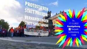 - Heizung, Brot & Frieden: Kundgebung – Sa. 17.12. 13:00 – U-Bhf TierparkDas Berliner Protestbündnis „Heizung, Brot und Frieden“ veranstaltet am 17.12.2022 ab 13 Uhr eine Kundgebung am U-Bahnhof Tierpark, Berlin-Lichtenberg: Protestieren statt frieren, Verhandlungen statt Sanktionen! Als Teil es Protestbündnisses „Heizung, Brot und Frieden“ rufen die Aktiven der Gewerkschaftlichen Linke Berlin zum Mitmachen und zur Mobilisierung auf. Unsere Forderungen: Lebensmittelpreise und Mieten runter, Löhne und Einkommen … Weiterlesen