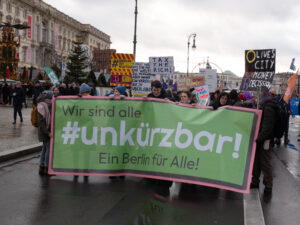 - „Wir sind nicht ein Teil des Problems sondern ein Teil seiner Lösung“Große Beteiligung an der Demo gegen Kürzungspolitik des Senats Unter dem Motto „Wir sind alle unkürzbar – Ein Berlin für alle“ versammelten sich dem nieseligen Winterwetter zum Trotz am Sonntag Mittag viele Tausende Menschen auf dem Lustgarten vor dem Berliner Dom und zogen anschließend in einer dicht gedrängten Demonstration durch die Stadtmitte. Es war ein … Weiterlesen