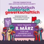 - Zentrale Demonstration zum internationalen Frauenkampftag – feministisch, solidarisch, gewerkschaftlichvon Peter VlattenEin breites Bündnis Berlin ruft alle am Frauenkampftag zur Demonstration auf 8. März, 11:30 Uhr, Berlin Oranienplatz Im Aufruf der IG Metall Bezirk Berlin-Brandenburg-Sachsen heisst es „Der Kampf um Gleichstellung ist auch 2026 noch nicht zu Ende. Deshalb ruft auch dieses Jahr ein breites feministisches, stadtpolitisches und gewerkschaftliches Bündnis am 8. März zur großen Demonstration … Weiterlesen