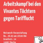 - Wie weiter beim Arbeitskampf bei den Vivantes Töchtern gegen Tariffluchtvon Peter VlattenNetzwerk-Veranstaltung Do., 26.03 18:00 Uhr, Graefestr. 1410967 Berlin Reinigung, Service, Technik: Tausende Beschäftigte bei den Vivantes Töchtern arbeiten schlechter bezahlt, schlechter abgesichert, ohne Tarifvertrag des öffentlichen Dienstes. Das ist kein Zufall, sondern Strategie: Tarifflucht auf Kosten der Beschäftigten. Mit dem aktuellen Arbeitskampf wehren sich die Kolleg*innen erneut gegen Ausgliederung, Lohndumping und Spaltung der Belegschaft. Sie … Weiterlesen