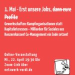 - Holen wir uns den 1.Mai zurück – Netzwerk Verdivon Peter Vlatten1 Mai – Erst unsere Jobs, dann Eure Profite Mittwoch 22. April um 19:30 Uhr Link: https://us02web.zoom.us/j/7186072157 Holen wir uns unseren 1. Mai zurück. Das DGB-Motto zum Tag der Arbeit ist dieses Jahr ,,Erst unsere Jobs, dann eure Profite“. Wir sagen: Lasst uns unsere Gewerkschaft zum Kampforgan machen! Über den 1. Mai, unseren neuen Newsletter und … Weiterlesen