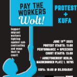 - „Pay the workers,Wolt!“ – SolidaritätskundgebungAm 19. Juni 2025 findet um 13 Uhr ein Prozess vor dem Arbeitsgericht Berlin statt. Sharma kämpft vor Gericht gegen Lohnraub und Subcontracting. Im November 2022 wurde Sharma, eine Studentin in Berlin, als Essenslieferantin für Wolt eingestellt. Zwischen November 2022 und Januar 2023 arbeitete sie für das Unternehmen und lieferte bei eisigen Temperaturen Bestellungen auf … Weiterlesen