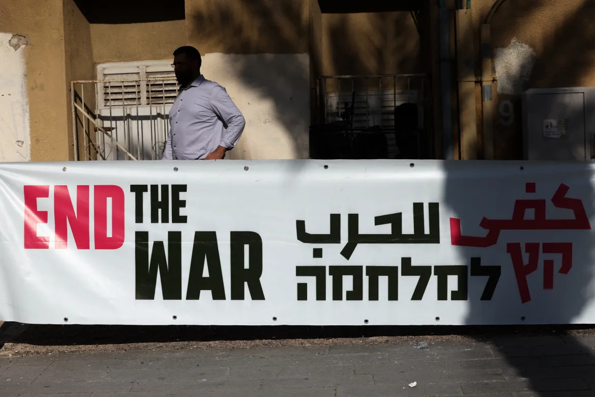 (9) Ein Mann steht hinter einem Transparent mit Aufschriften in Arabisch, Hebräisch und Englisch, auf dem das Ende des Krieges gefordert wird.