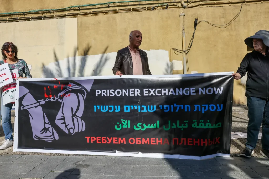 (4) Menschen stehen hinter einem Transparent, auf dem ein Gefangenenaustausch zwischen Israel und der Hamas gefordert wird.
