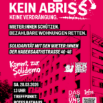 - „Rekommunalisierung jetzt!“DAS GEHT UNS ALLE AN: Mieter:innen der Habersathstraße 40-48 unterstützen! AUFRUF ZUR SOLI-DEMO FÜR DIE HABERSAATHSTRAßE 40-48 IN BERLIN MITTE Entmietung mit Kälte, Gewalt und Zerstörung – mitten in Berlin, mitten im Winter. KOMMT ZUR SOLI-DEMO Soli-DemoSamstag, 28.03.202613:00 UhrTreffpunkt: Vor dem Roten Rathaus Siehe Demo-Route unten. WORUM GEHT ES? In der Habersaathstraße wird seit Jahren … Weiterlesen