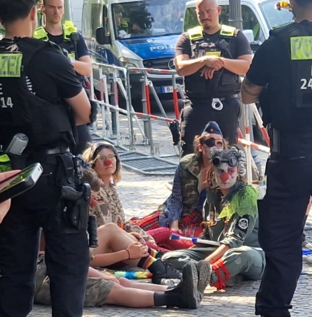 Im Zuge der heutigen Proteste gegen den Veteranentag hat sich in Berlin offensichtlich eine Gruppe von Clowns duch „Streitkräfteveräppelung“ der Staatsgefährdung schuldig gemacht.